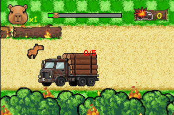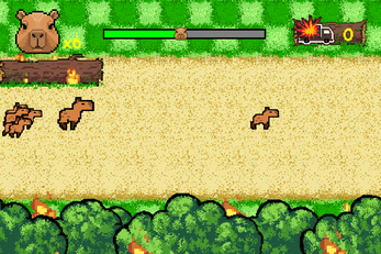 The game follows the journey of a group of capybaras trying to escape a forest fire, fleeing from flames and illegal logging trucks until they reach the riverbank, their safe haven.